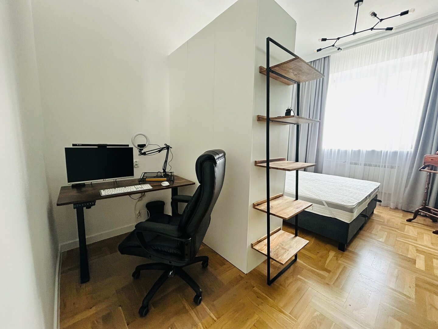 W obu pomieszczeniach znajdziesz telewizor, klimatyzację oraz przestronną szafę. W sypialni znajduje się specjalnie wydzielona przestrzeń z biurkiem typu fly desk oraz ergonomicznym fotelem, dodatkowym monitorem i kamerą HD, która pozwoli Ci komfortowo pracować zdalnie.